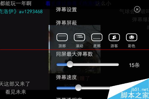 4、点击齿轮,可以设置弹幕的数量,速度,透明度等。上面一列是屏蔽屏幕上那一部分的弹幕的设置。
