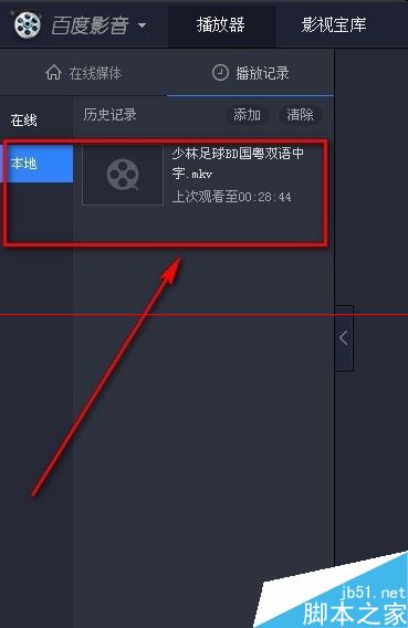 6、如果在看电影时并没有看完,那么在下次播放时,可以直接打开百度影音左侧的播放记录列表,在【本地】列表中可以找到直接播放之前的影音文件。