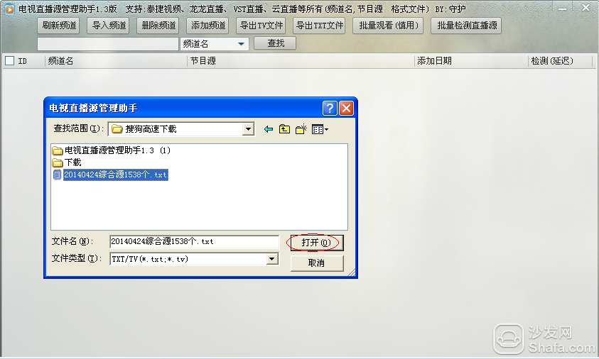 3、点击上边的“导入频道”,在蹦出的对话框选择你需要检测的电视源txt文件或者TV文件。