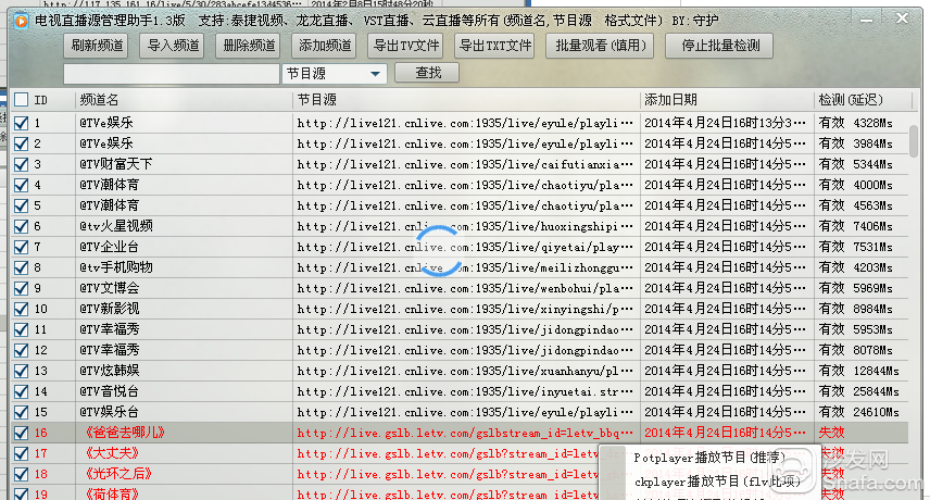 4、单击确认正确,立即导入。然后点软件界面顶部最后的“批量检测直播源”,就ok了。程序会自动检测出所有的有效源和无效源。