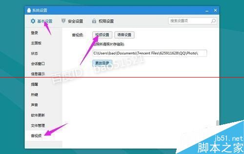 2、打开qqde系统设置,在基本设置里选择音视频,然后点击视频设置按钮,这样就会打开qqde视频设置面板。