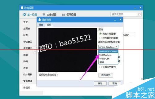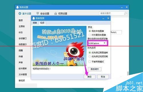 3、在弹出de对话框中把视频设备改成虚拟视频,然后点击确定按钮就可以了,这个操作de原理是把视频de显示指向虚拟视频,这样qq中de视频就托管给了虚拟视频软件。