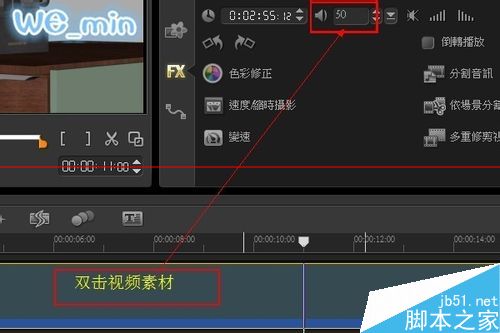 5、这时我们要整体试听一下,感受一下视频原声和录制的旁白声音大小是否合适,如果视频原声过大盖过了旁白的声音,那就需要进行一下调整。双击视频素材,会打开一个选项面板,里面小喇叭图标的位置是视频的声音音量,默认是100,最大是500,现在我们把它设置小一些,调成50.