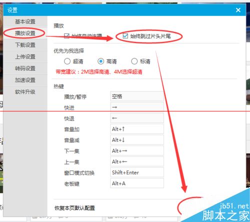 3、在【设置】界面下,点击选择【播放设置】--勾选【始终跳过片头片尾】--【保存】选项完成设置。(如图所示)