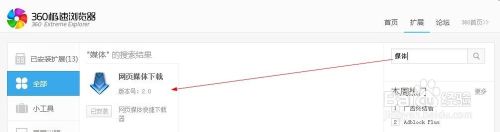 2、在扩展中心搜索“媒体”,然后将“网页媒体下载”添加到浏览器