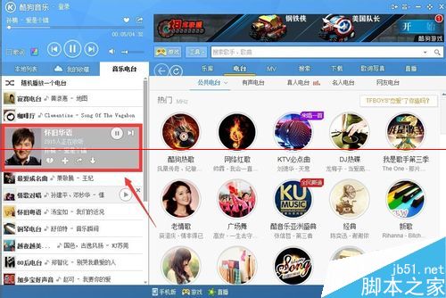 2、我们随意选择一个电台收听,正在播放的电台变成了下图框选的样子。