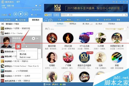 3、在正在播放的电台中有一个加号,指的是收藏到列表。我们点击这个加号,就会跳出下拉菜单。