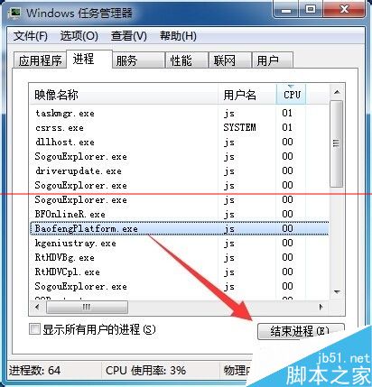 3、从打开的“任务管理器”界面中,切换到“进程”选项卡,找到“暴风影音”进程,点击“结束进程”按钮将其结束掉。