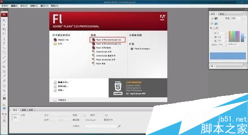 打开flash软件,如图我们选折新建项第一个:flash文件(Actionscript 3.0)