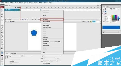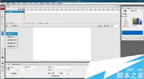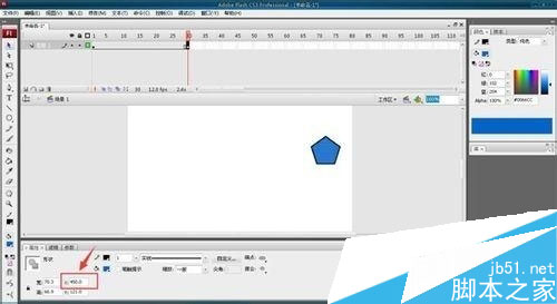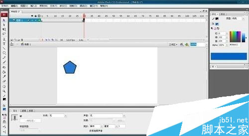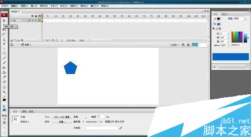 我们选择在图层1的第一帧,有数字的行列上的单位都为帧,我们的场景上画一个5角星形,然后选择左边栏的选择工具,选中整个图形,这步我们最需要注意必须要选择左边栏的选择工具,不然图形无法选中,因为我们之前选择的是多边星形工具,所以不选择选择工具,我们就无法选中图片,而是画的多边星形。