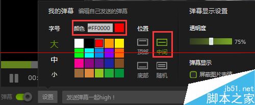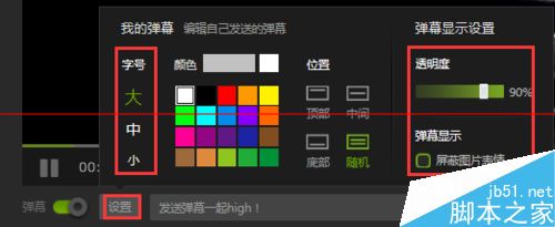 4、点击弹幕功能里的【设置】按钮,可以设置字号,颜色,显示位置,透明度,是否显示图片表情等信息,如下图所示。