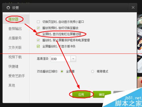 3、在【设置】界面下,点击选择【播放器】--勾选【全屏时,显示控制栏在屏幕边缘】--【应用】选项完成设置。(如图所示)