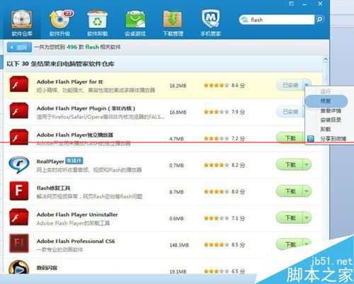 1.打开【电脑管家】→点击【软件管理】,在搜索框中输入"flash"→找到相应版本点击【安装】或【升级】(如果以安装请点击下箭头后选择修复,如此步骤无法成功修复,可继续执行第二步骤再进行此步骤)