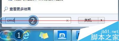 1.点击【开始】菜单→在搜索框中输入"cmd"→按键盘enter(回车)键: