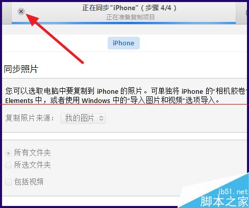 4、如果长时间卡在这里,而没有出现复制进度,可以点击左侧的小叉号,重新点击同步