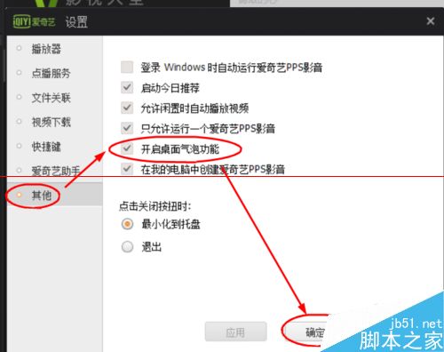 3、在【设置】界面下,点击选择【其他】--勾选【开启桌面气泡功能】--【确定】选项完成设置。(如图所示)