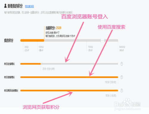 积分获取:1,使用百度浏览器。2,使用百度搜索。3,但进入其他网页也能获取积分哦(注意:要是你用浏览器不登账号,不仅不会给你积分,积分还会一天天消失的)