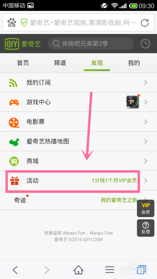 2、进入手机百度浏览器主页-点击爱奇艺窗口-再点击发现-点击下面的活动,这时你就能发现爱奇艺的会员赠送了(我这幅图的这期活动是要花一分的,有时候是不用的)