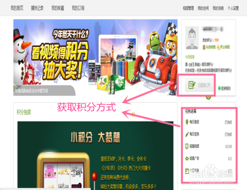 1,签到。2,看视频。3,看广告。4,做任务。这些都能获取积分