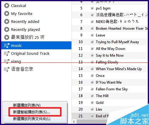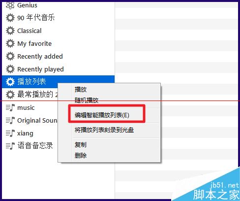 9、可能还有一个问题,就是所有在这段时间添加的文件(比如视频、书籍)都会显示在这个列表内,如果只要显示音乐,右击播放列表,选择【编辑智能播放列表】,再添加一个规则