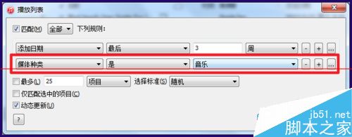 10、点击第一个规则后面的【+】,就可以再添加一个规则,设置如下,选择【媒体种类】为【音乐】,这样只有音乐才能显示在这个播放列表内了