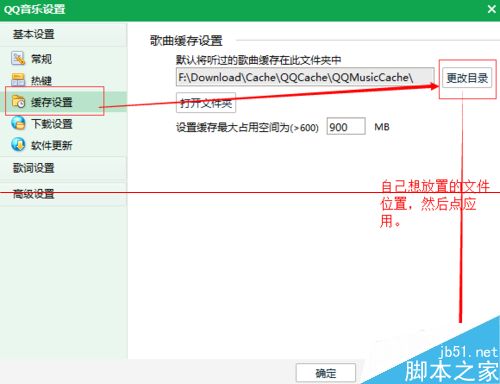 3、点击缓存目录设置,并设置好自己想放置的文件夹。(这时设置好了,但是有很多的下次运行QQMusic时会发现缓存设置的地址又变回某盘符的根目录去了(就是这Bug)。-----无效的请继续往下看。)