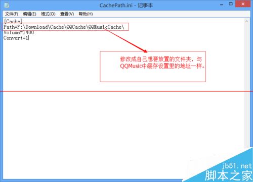 2、Path=F:\Download\Cache\QQCache\QQMusicCache\中Path=后面的为自己想放置的文件夹位置。
