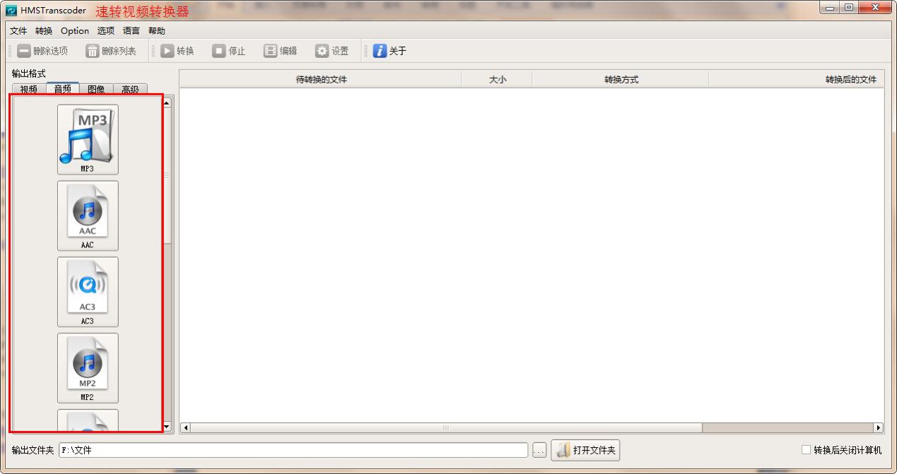 在音频转换方面,速转视频转换器可以高速地将各种主流音视频格式,如MP3、WMA、MP2、等格式,编辑转换输出AC3、MP2、WMA、AMR、OGG、FLAC等音频格式。