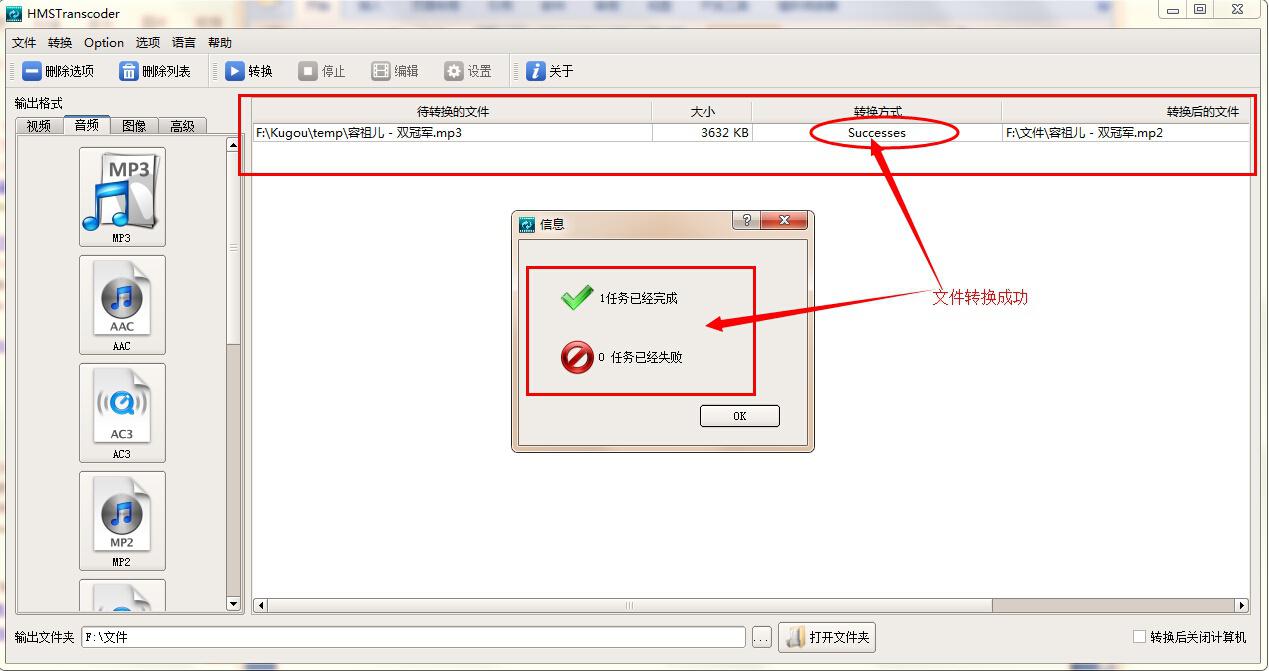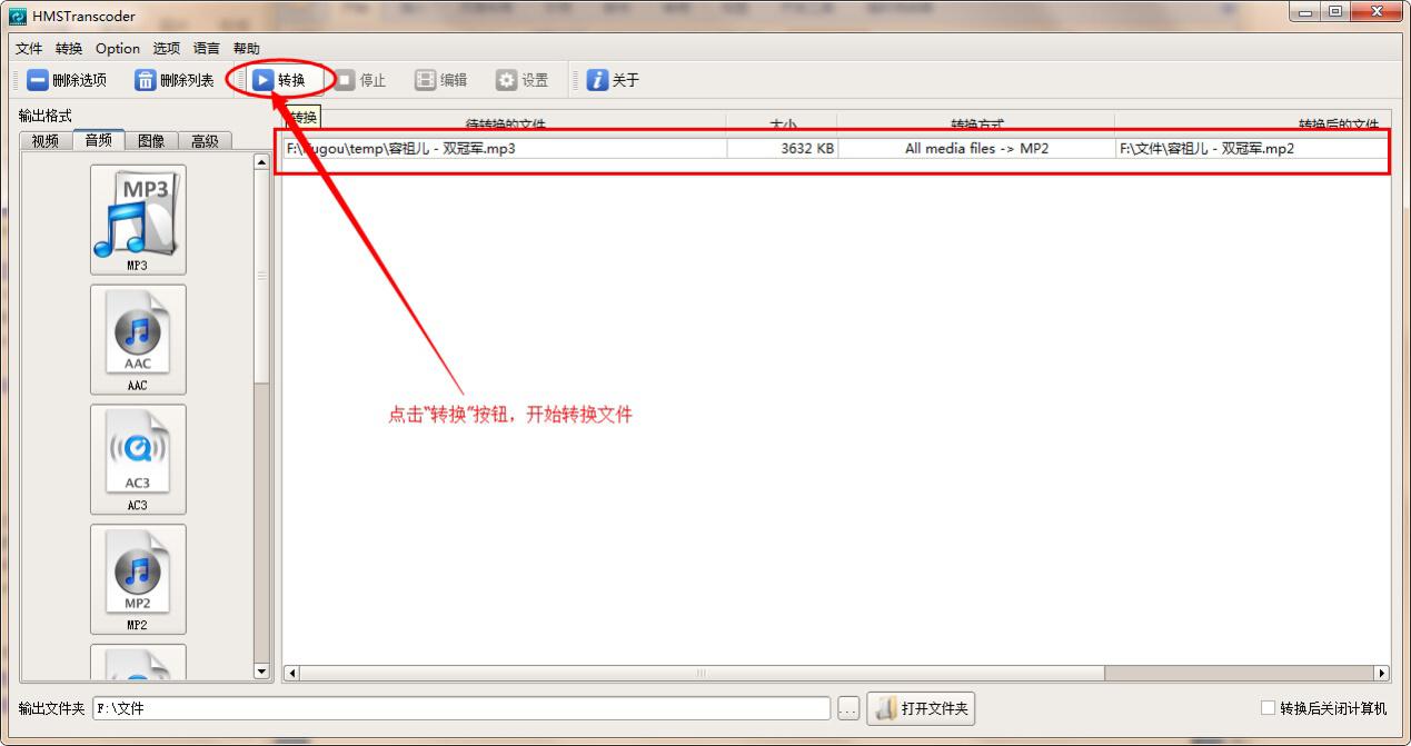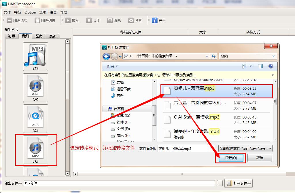 3、这里我们以MP3文件为例,将其转换成MP2格式。点击软件左侧音频列表下的“MP2”按钮,在打开的窗口中找到需要转换的MP3文件,选定,然后点击“打开”按钮,转换文件添加完成。