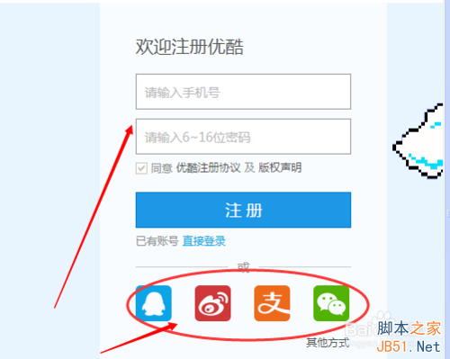 点击注册,输入自己的手机号,当然如果你不想用手机号,也可以选择下面的方式直接登录,qq号 新浪微博 微信 支付宝都可以直接登录优酷