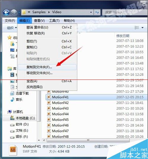 12、如果我们只想把这一个flash的动画存储起来的话,只选择一个,如果想多个选择的话,就按着键盘上的ctrl键进行多个选择。选择好之后,点击菜单中的编辑,复制到文件夹。