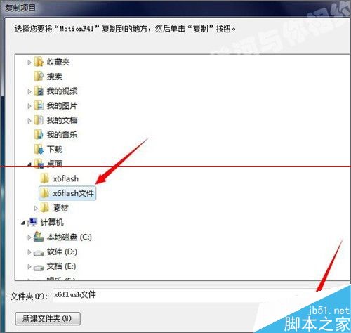13、这里在它弹出的复制项目的面板中就把它选择放到桌面,点击下面的新建文件夹,把它命名为x6flash文件。