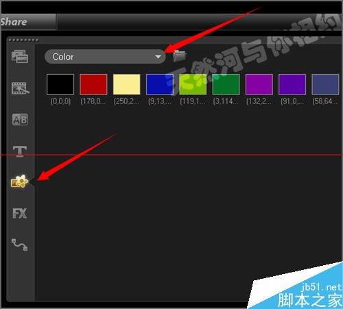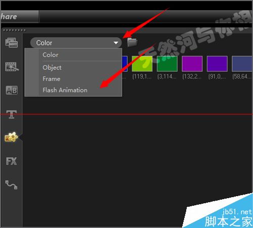 1、如是果是想要把它会声会影中的flash动画保存到一个文件夹中,我们可以通过它的安装目录或者是直接在软件的界面中进行查找 。这里就选择在软件的界面中进行查找。首先打开我们的软件后,可以在右边的界面中看到它的图形图标,当你点击一下之后,默认的在里面可以看到的是颜色。