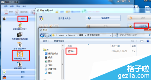 1、打开格式工厂,单击视频---所有转化为AVI,单击添加文件,打开视频文件夹,双击视频001打开视频。然后点确定,单击“点击这里开始转换”,直到完成。