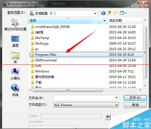 3、这时候它就会弹出一个对话框,我们找到会声会影安装位置。如果您在安装的时候是没有更改它的路径的话,是默认在c盘的。这时候我们点击打开c盘。在面板的列表中找到Program Files的文件夹。