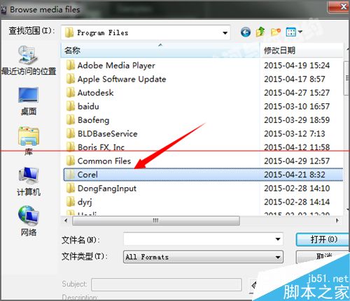 4、双击打开Program Files的文件夹后,在打开的面板中选择Corel的文件夹。如果在你的电脑上安装了多个版本的corel软件的话,它都会默认的安装到这个文件夹中。