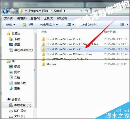 5、接着双击打开Corel的文件后,在弹出的面板中找到Corel VideoStudio Pro X8的文件夹。每个人安装的版本不同,找到自己的软件版本即可。