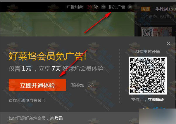 1、打开腾讯视频 v.qq.com 随便找个视频播放,看到广告点击“跳过广告”(部分浏览器开启广告屏蔽功能需要关闭,不然看不到广告)。小编测试视频地址:http://v.qq.com/cover/w/whdf23rl0e71253.html?vid=z01561xv2ol