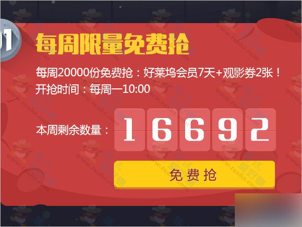 1. 活动每周提供20000份“好莱坞会员7天体验资格”,QQ会员/超级会员可于每周一上午十点开始领取,数量有限,先到先得。