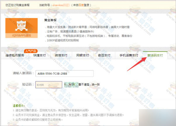 6、打开爱奇艺官网 http://www.iqiyi.com/ 点击开通VIP会员【选择激活码支付】