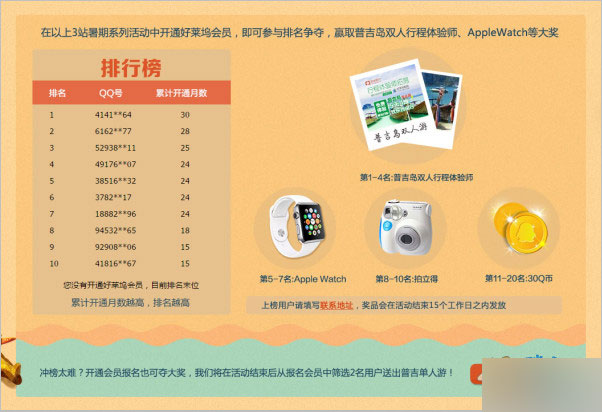 2. 活动结束后,根据开通好莱坞会员的月份数排名,第1-4名的用户将获得普吉岛双人游资格,第5-7名名获得Apple Watch Sport一台,第8-10名获得拍立得一台,第11-20名获得30Q币,上榜用户请填写个人信息,活动结束后15个工作日内会将奖品寄到您填写的地址,数码奖品的参数配置以最终收到的实物为准,如因个人信息缺失而无法获得奖品,不予补送;