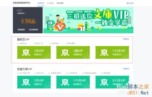 3、在特权中心,可以看到兑换爱奇艺是需要浏览器积分的但是不多,当积分达到300时可以兑换一天VIP;当积分达到1800时可以兑换7天VIP;当积分达到7000时可以兑换1个月VIP