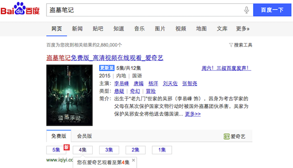 首先大家可以下载一个爱奇艺的客户端,手机和电脑都行,小编为了方便起见将就直接使用web观看了,大家百度盗墓笔记,就能直接搜索到该影片: