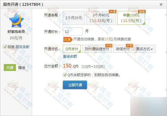 1、150Q币开通12个月好莱坞会员返还12Q币,开N次送N次