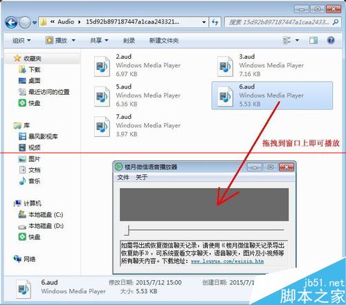 3、苹果手机微信语音文件的播放方法也是一样,只需要将苹果手机微信语音文件拖放到软件界面上即可播放。苹果手机微信语音文件的后缀为.aud。