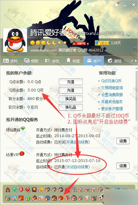 3、这样便可点亮图标了,点亮成功后“开启自动续费”,再“隐藏图标”坐等过期,就这么简单【开启自动续费Q币的余额不要超过10Q币,不然真的续费了你还以为卡住的~】
