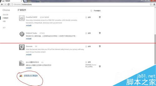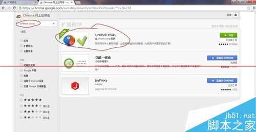 5、这样就进入了 Chrome网上应用店,在左侧的输入框中,输入unblock youku,搜索后右边出来该扩展程序,在后面应该有个蓝色的标识“添加至CHROME”,直接点击该标识即可。下图中因为本人电脑已经添加了,故没有蓝色标识了