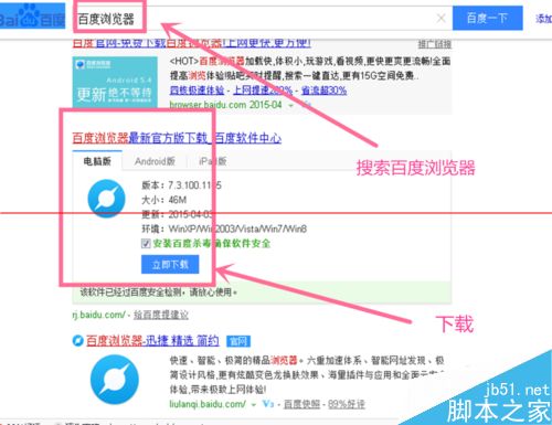 1、下载浏览器:首先,我们打开百度搜索,在其中输入“百度浏览器”,这时会出现搜索结果,点击百度浏览器下载。