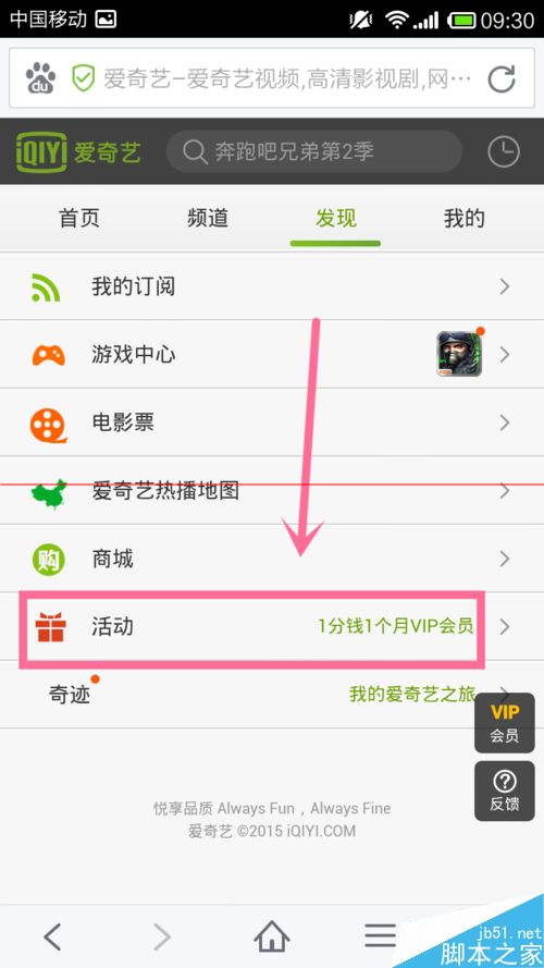 2、进入手机百度浏览器主页-点击爱奇艺窗口-再点击发现-点击下面的活动,这时你就能发现爱奇艺的会员赠送了(我这幅图的这期活动是要花一分的,有时候是不用的)