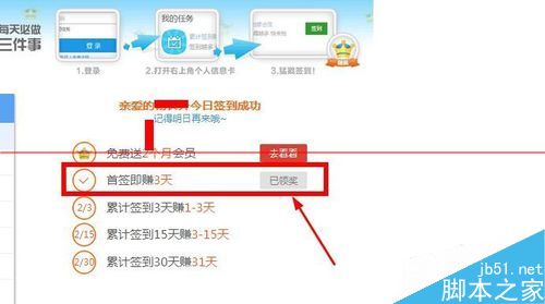 3、进入到签到页面我们可以看到提示我们今天已经成功签到了,首签即赚3天,累计签到3天赚1-3天,累计签到15天赚3-15天,累计签到30天赚31天